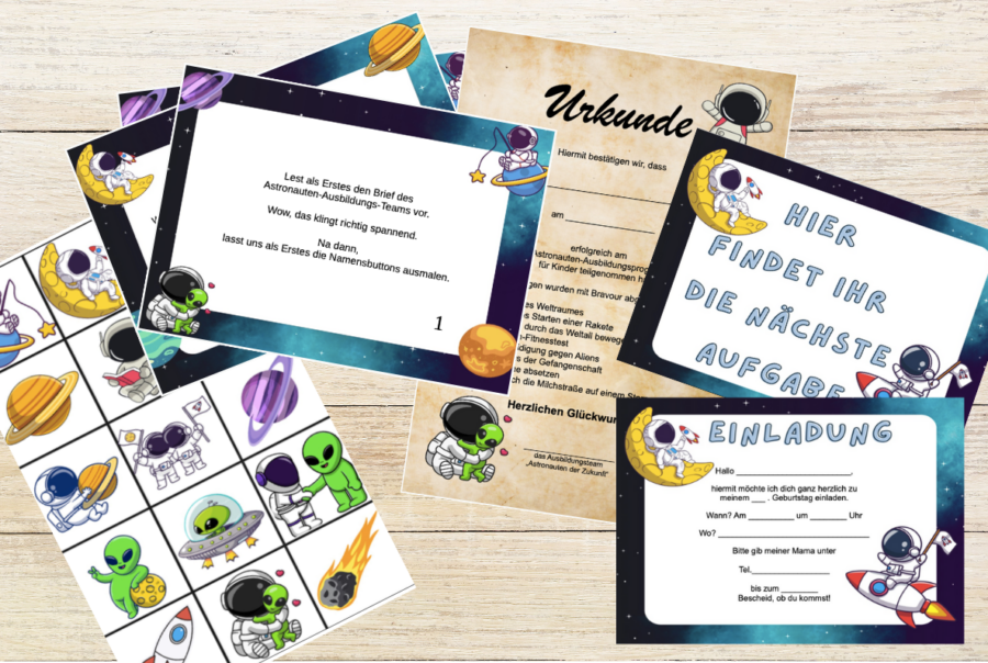 Abgerundet wird das Ganze durch viele süße Details bei den Druckvorlagen, eine Vorlage für Namensbuttons, Briefe des Astronauten-Ausbildungsteams, Urkunden und Einladungskarten zur Geburtstagsfeier.