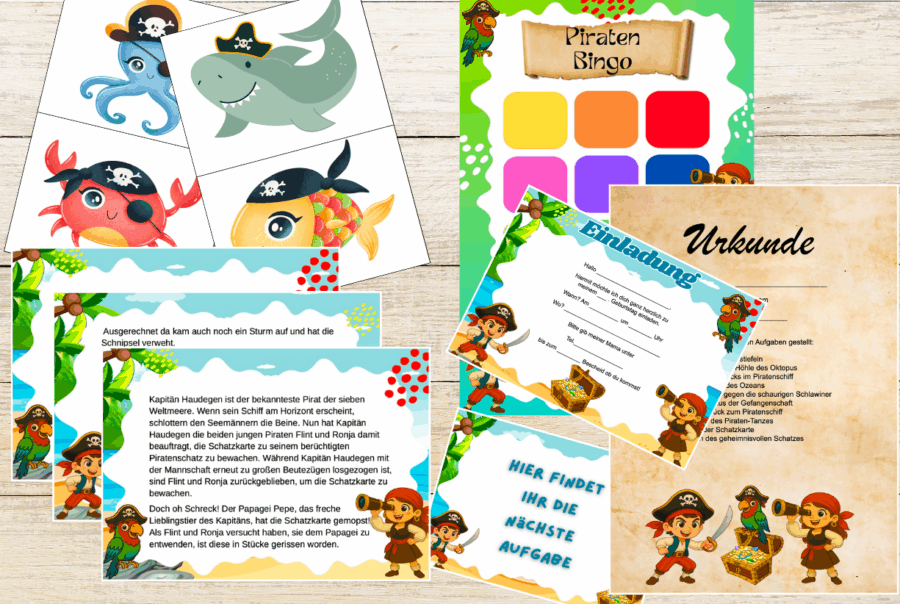 Um die Strecke zwischen den einzelnen Programmstationen nicht langweilig werden zu lassen, gibt es auch einen Laufzettel „Piraten-Bingo“ für Beschäftigung unterwegs. Abgerundet wird das Ganze durch detailreiche Druckvorlagen, Urkunden und passenden Einladungskarten zur Geburtstagsfeier.