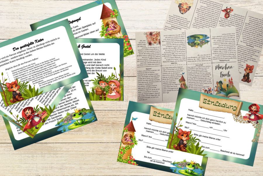 Abgerundet wird das Ganze durch viele süße Details bei den Druckvorlagen, eine Druckvorlage inklusive Bastelanleitung, mit der du ein kleines Märchenbuch für jedes Kind ausdrucken kannst und die passenden Einladungskarten zur Geburtstagsfeier.